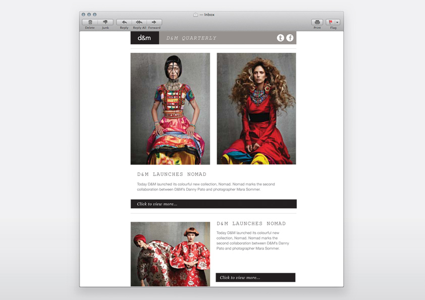 Core to our response was utitilising the iconic photographic collections they salon product on a quarterly basis. We created an editable background template that would reflect the current collection of the time. Editorial and News sections of the site also allow for D&M to show off their world class collaborations.