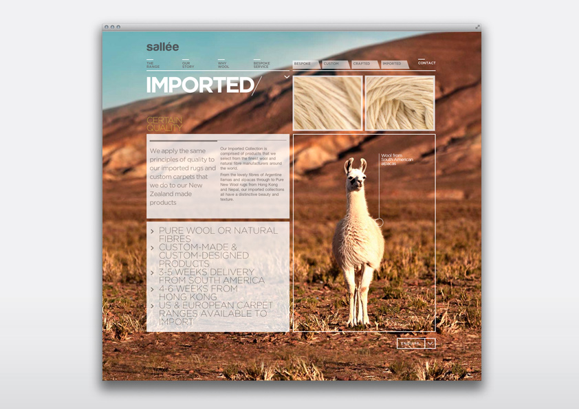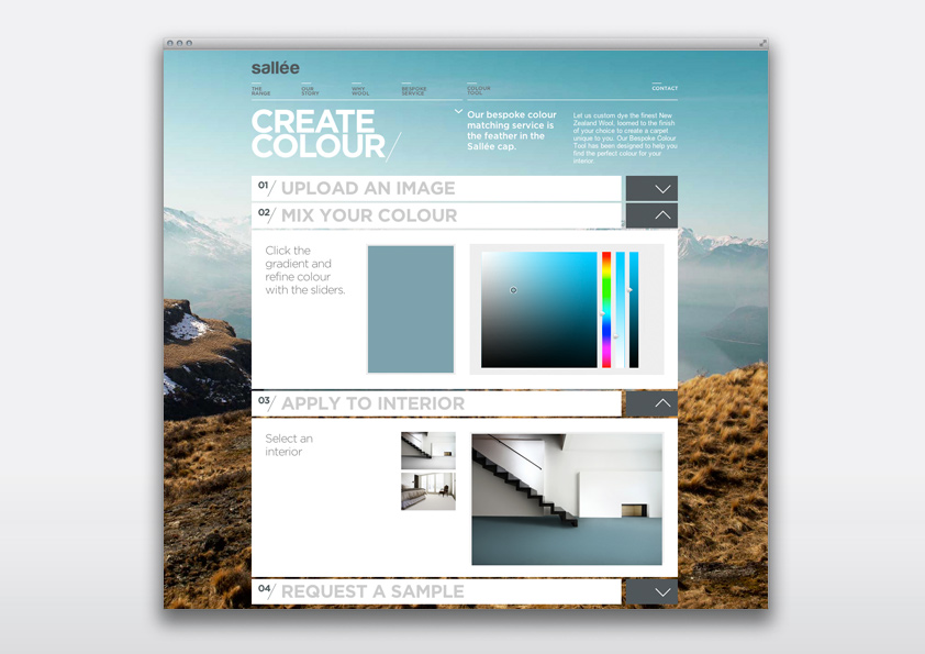 A 'Colour Tool' was designed and built that would promote their Bespoke Carpet offering. Users can upload their own images for a colour reference or create and fine tune a colour palette and request loom samples direct from the website. This tool has become an integral part of the Sallee service offering and has had a direct result in an increase for their Bespoke business.