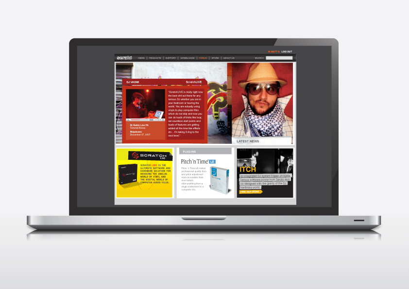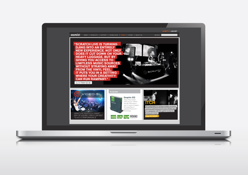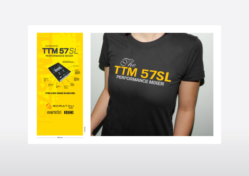 Website concepts for a new Serato website. Homepage concept was to showcase one international DJ per week who was using Serato Scratch Live. Scratch Live DVD sleeve design and DVD title design. Logo, trade show exhibition stand and t-shirts for the new TTM57SL mixer launch.